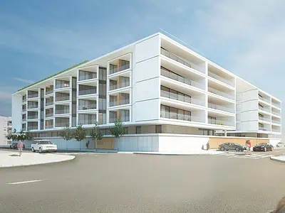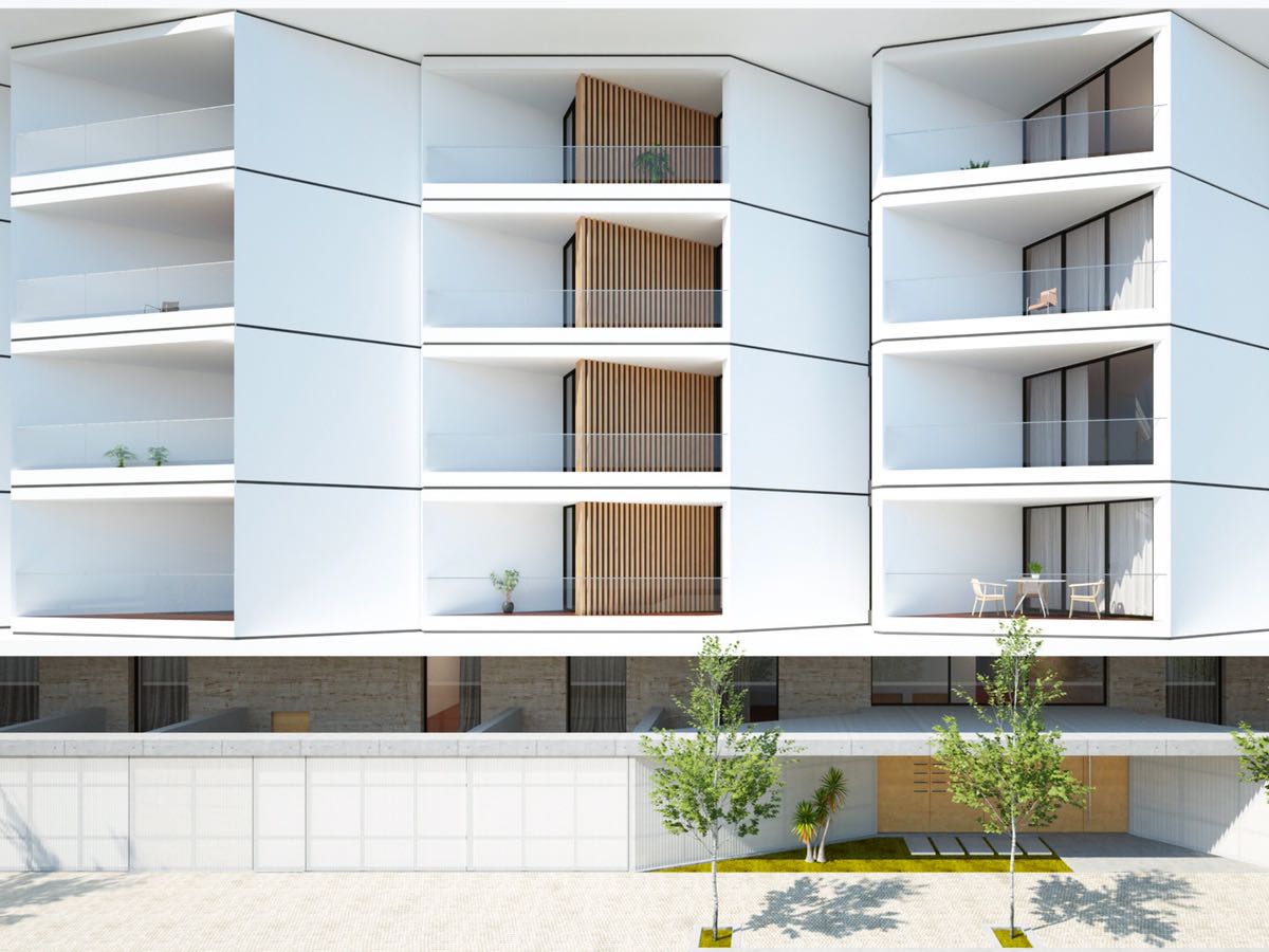 À vendre appartement neuf de luxe à Olhão, dans une résidence de haut standing en bord de mer, architecture moderne et minimaliste.
