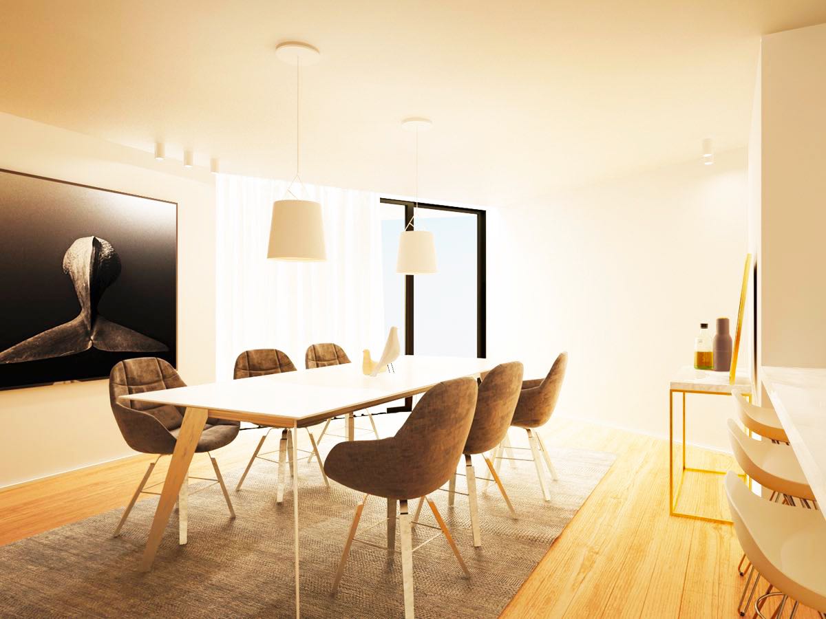 À l’intérieur, la cuisine est ouverte sur un salon-séjour pour créer un vaste espace de vie agréable donnant sur la terrasse.