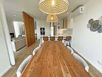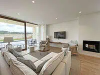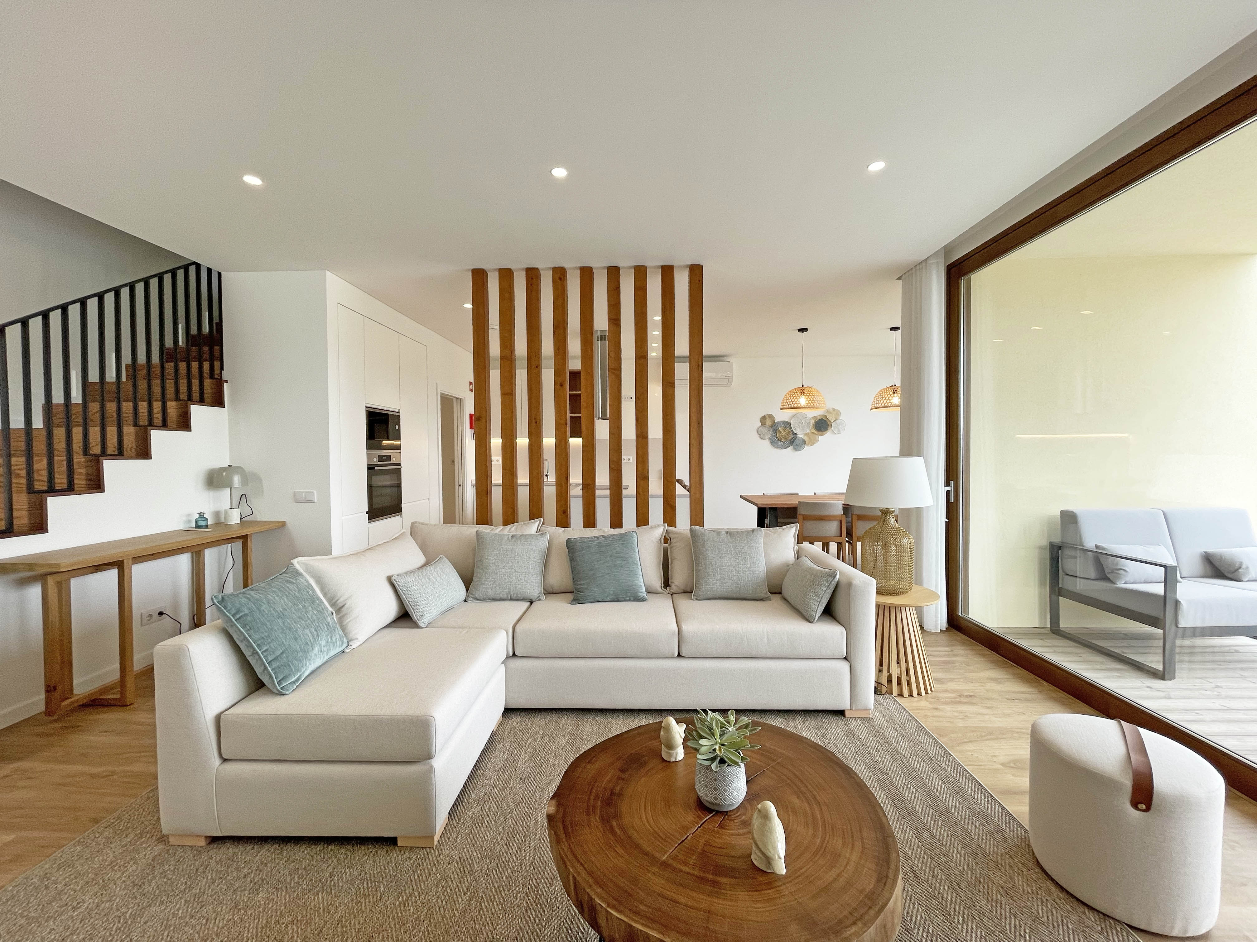 Au rez-de-chaussée, la maison se compose d'une belle pièce de vie baignée de lumière naturelle, avec cuisine entièrement équipée ouverte sur un salon profitant d'une vue magnifique sur le golf, l'océan Atlantique et la piscine dans le jardin.