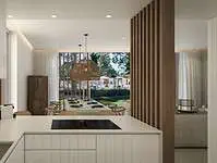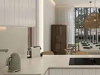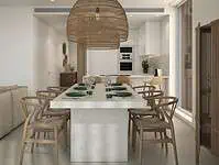 La partie jour de l'appartement se compose de la façon suivante : une pièce de vie avec salon et salle à manger avec terrasse couverte de 80.15 m². Et d'une belle cuisine de 8.56 m² avec terrasse couverte de 80.15 m² pour vos repas entre amis.
