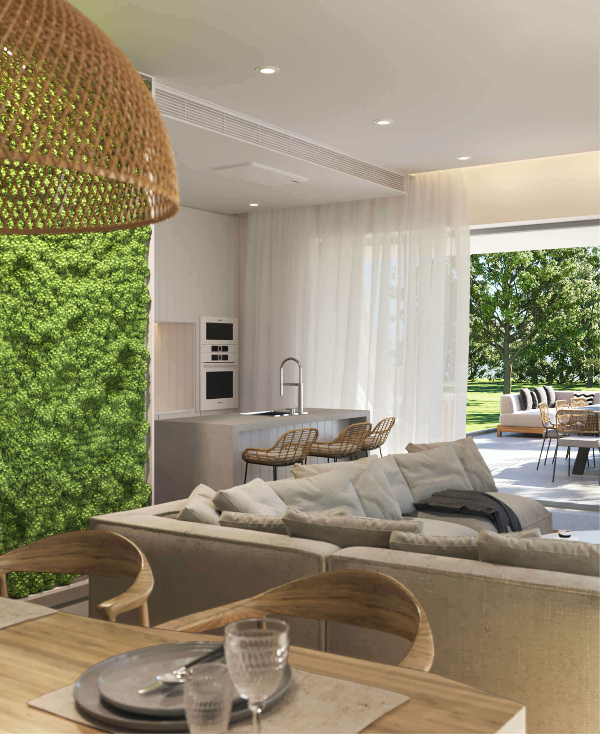 La partie jour de l'appartement se compose de la façon suivante : une pièce à vivre avec séjour avec cuisine américaine avec terrasse couverte.