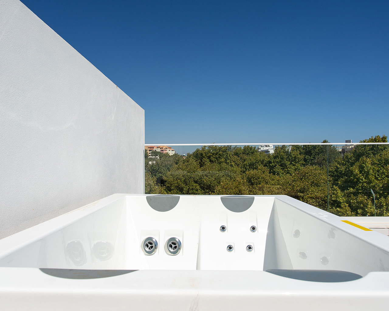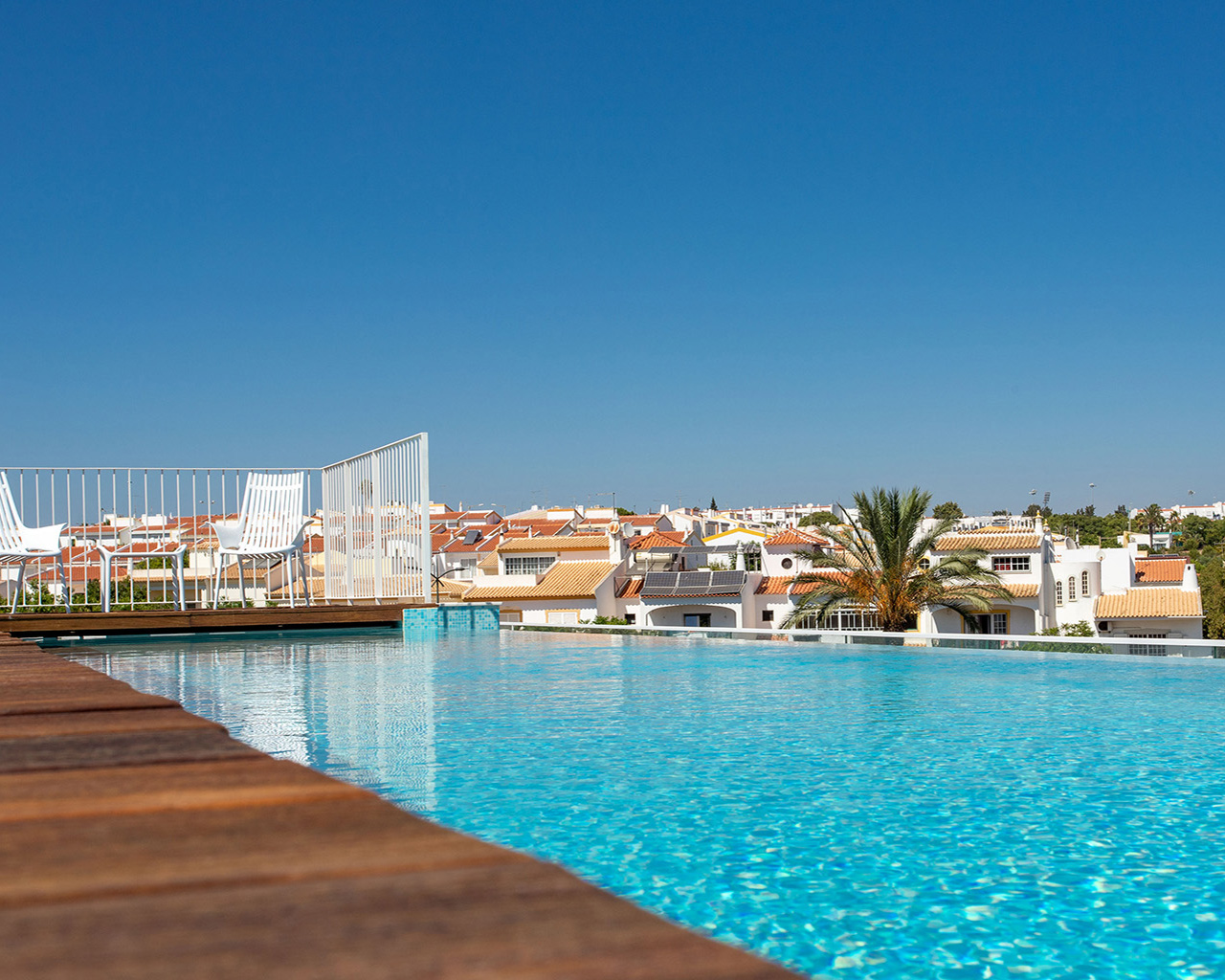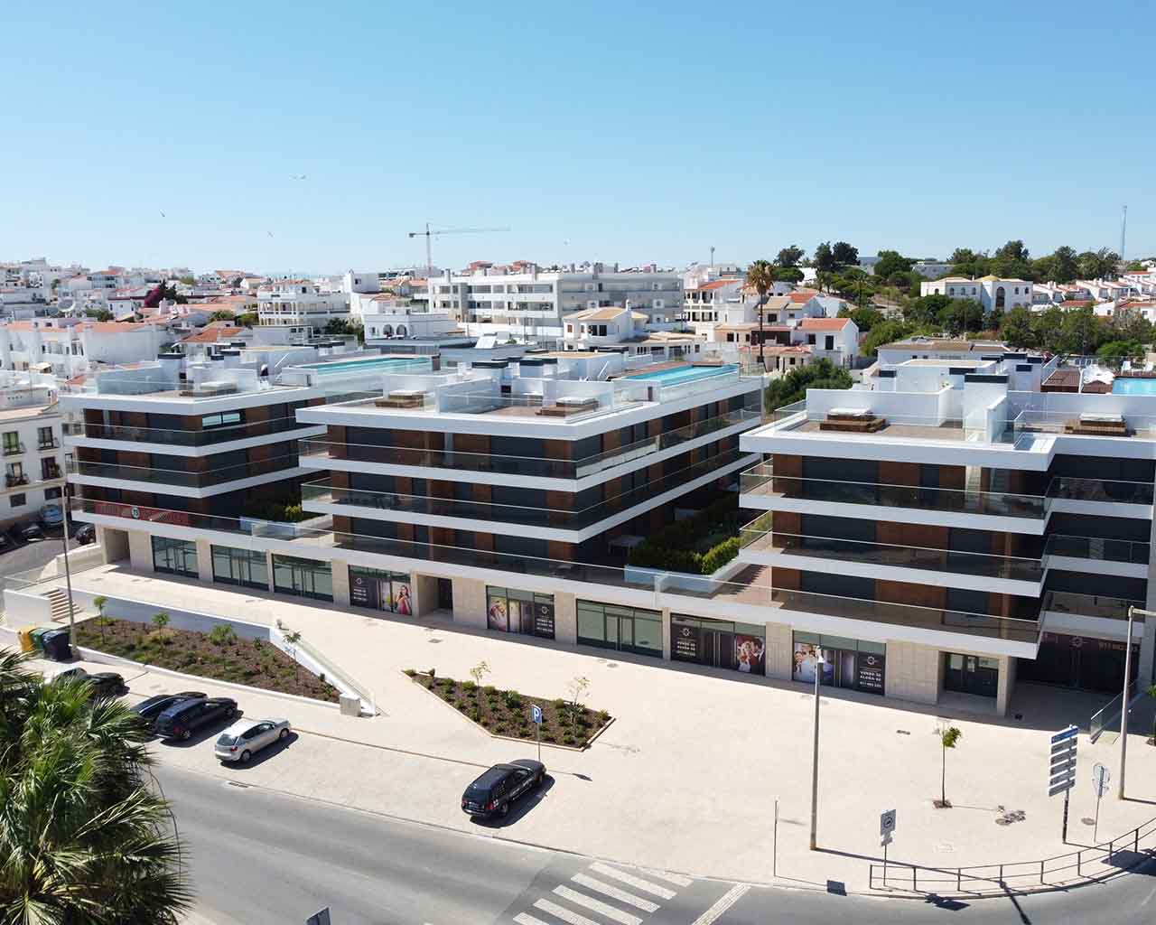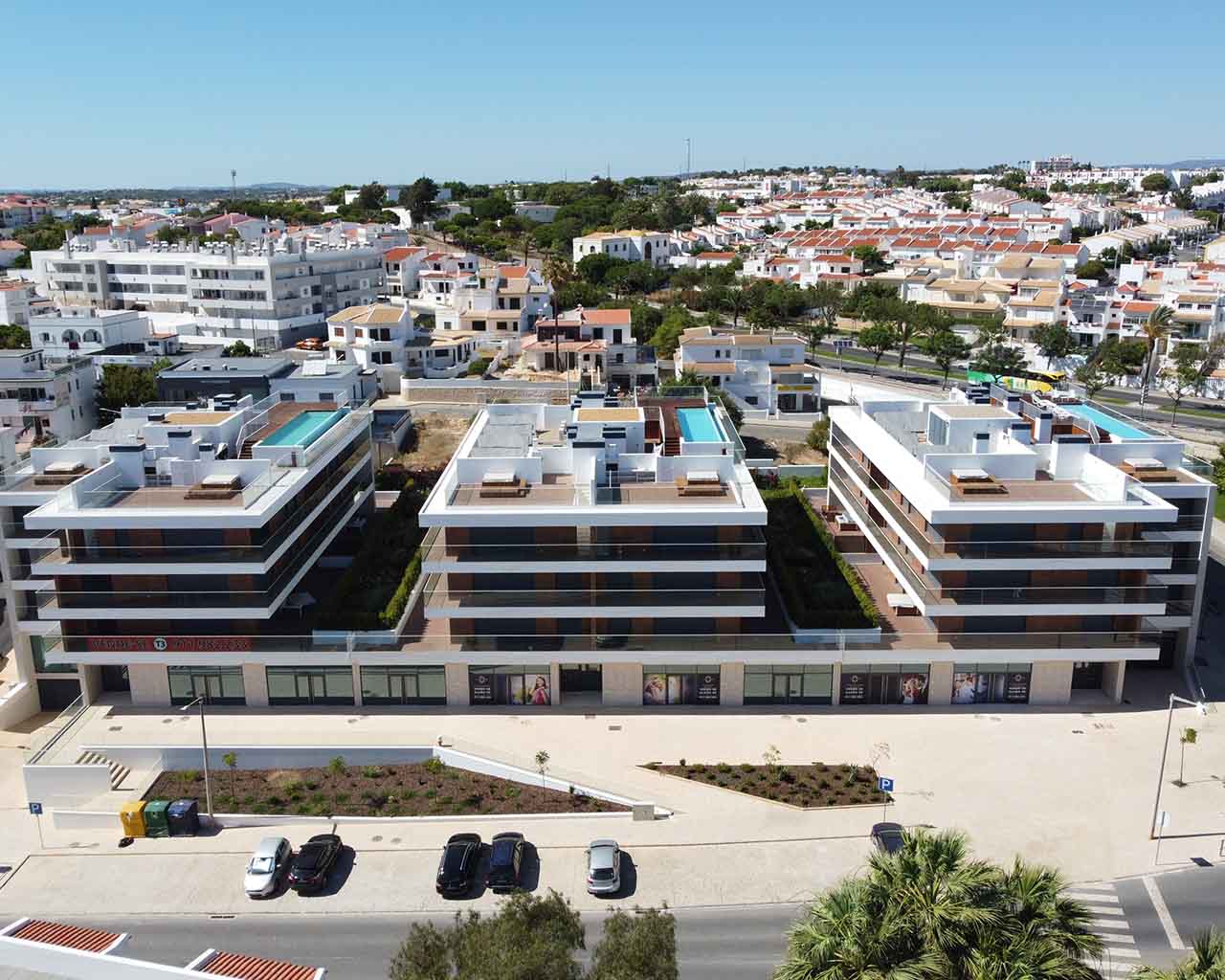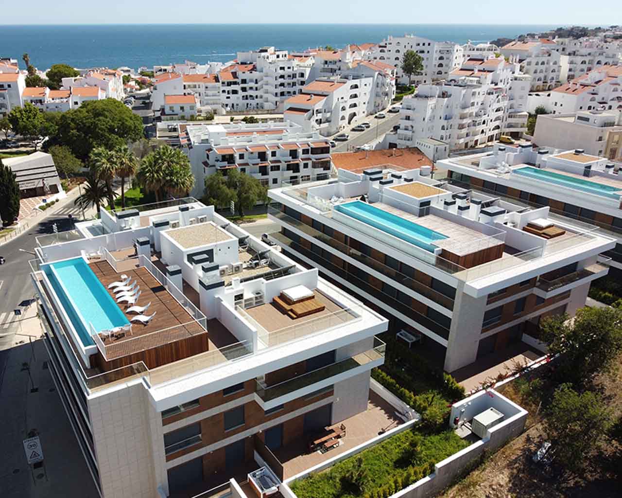 This high-end development in Albufeira stands out for its proximity to the seafront (7 minutes on foot), its privileged location in the heart of the historic center of the city, for its facilities with a rooftop swimming pool for each of the buildings of the condominium, for its outdoor spaces with large terraces and green areas.
