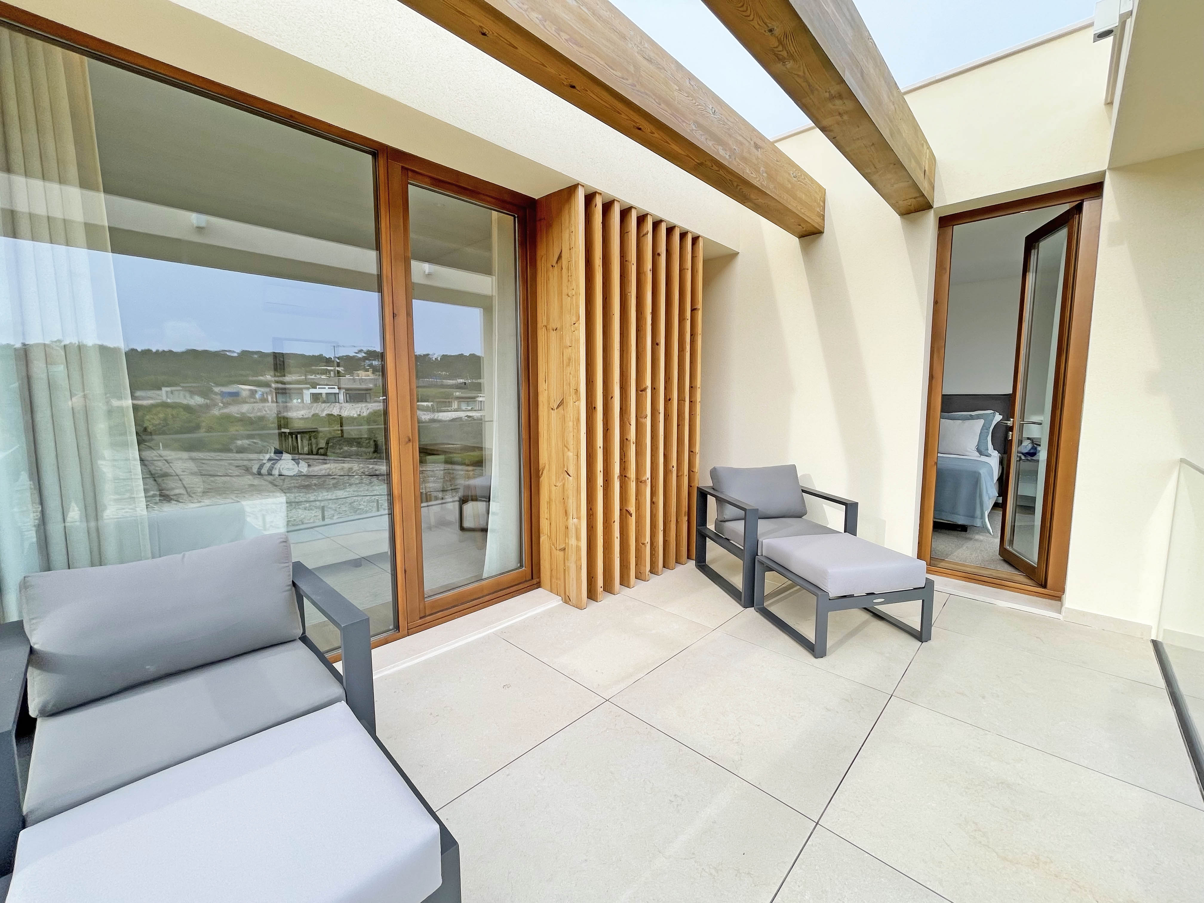 On the first floor, the house is composed of a beautiful living room bathed in natural light, with a fully equipped kitchen opening onto a living room with a magnificent view of the golf course, the Atlantic Ocean and the pool in the garden.