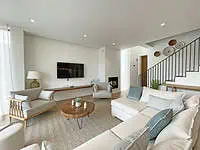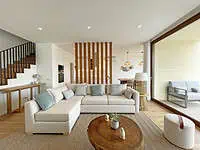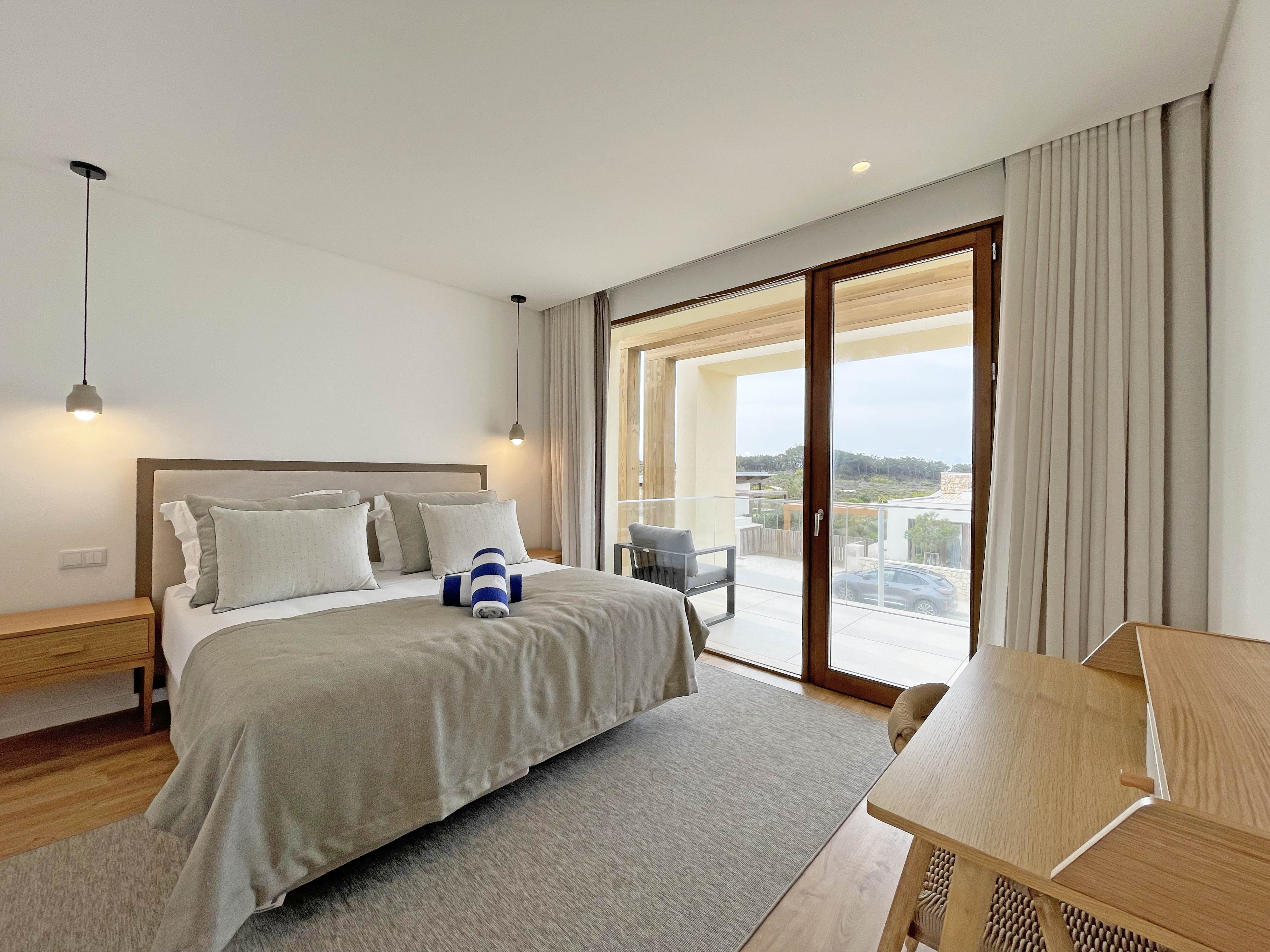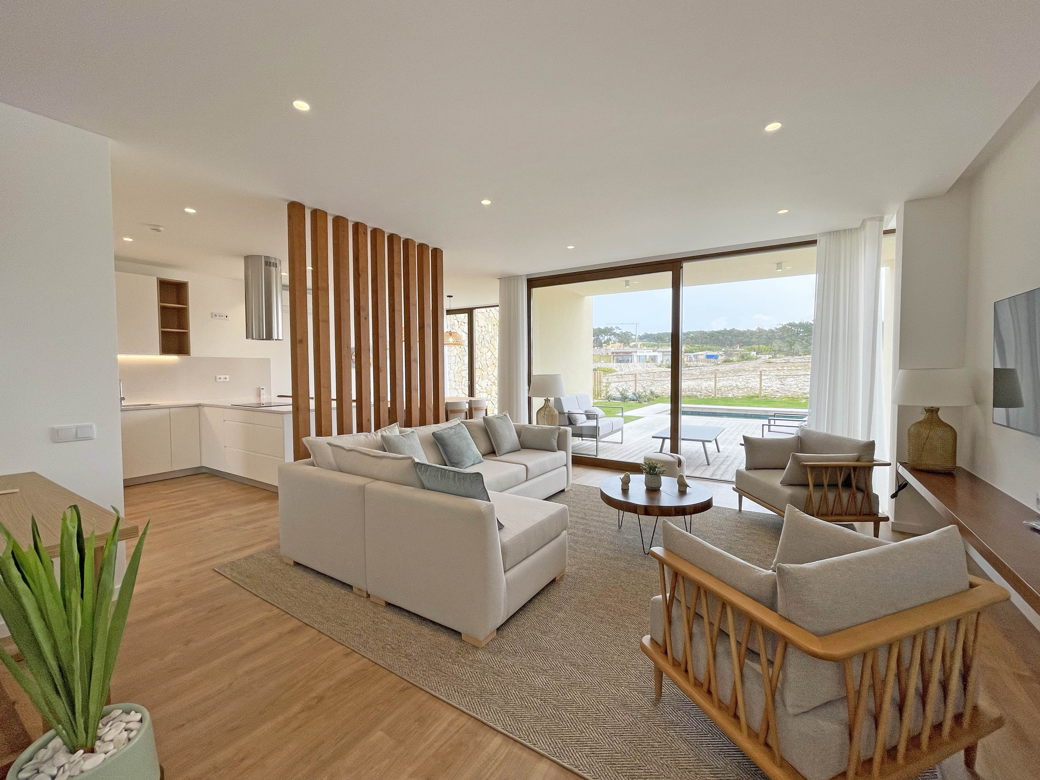 No rés-do-chão, a casa é composta por uma ampla sala, banhada em luz natural, com uma cozinha totalmente equipada que se abre para uma sala de estar com uma vista magnífica para o campo de golfe, o Oceano Atlântico e a piscina no jardim.