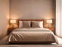 A escolha de materiais e acabamentos dá à casa uma atmosfera suave e relaxante, sublinhada por um luxo discreto com paredes de estuque pintadas, pavimentos e portas de madeira crua, materiais naturais e quentes que oferecem uma decoração interior refinada, mas sofisticada, com cores suaves e neutras para que a tranquilidade e harmonia com a natureza da zona surjam em todos os quartos da casa.