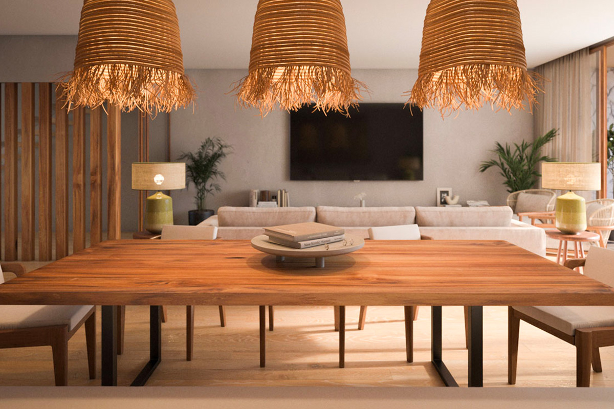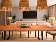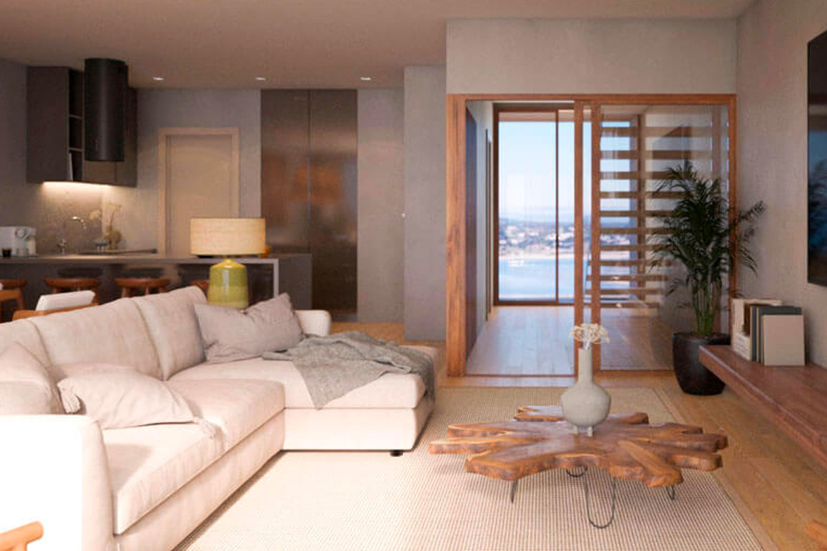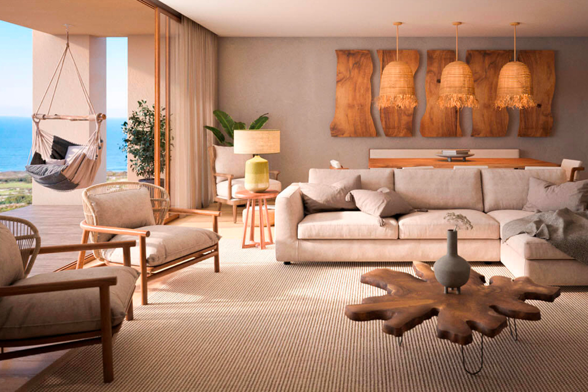 A escolha de materiais e acabamentos dá à casa uma atmosfera suave e relaxante, sublinhada por um luxo discreto com paredes de estuque pintadas, pavimentos e portas de madeira crua, materiais naturais e quentes que oferecem uma decoração interior refinada, mas sofisticada, com cores suaves e neutras para que a tranquilidade e harmonia com a natureza da zona surjam em todos os quartos da casa.